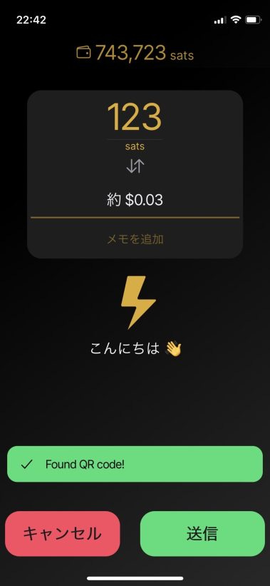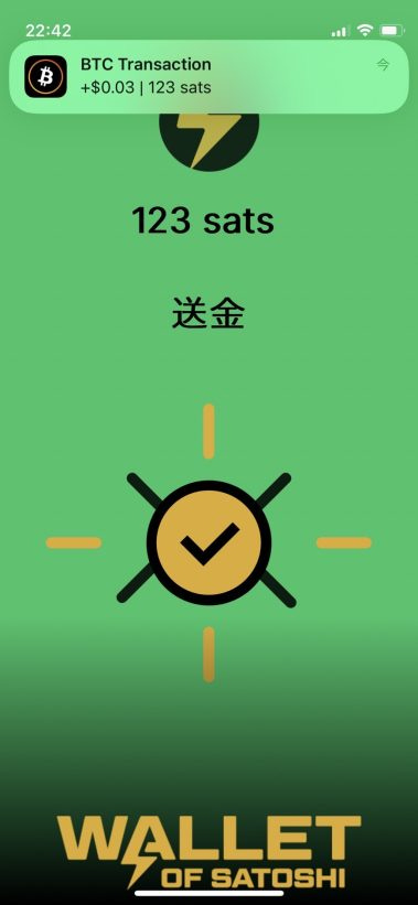 上の画像のとおり、実際に僕の Wallet of Satoshi から 123 sats を、Blink Wallet アプリに送信(送金)してみました。