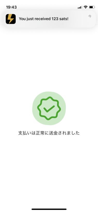 先ほど Blink Wallet アプリで設定したQRコードを読み込むと、123 sats が反映されました。