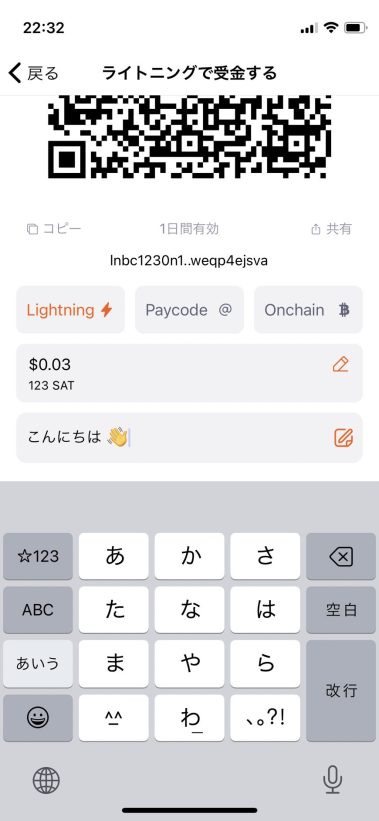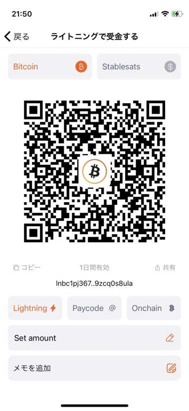他の Lightning Wallet からQRコードを読み込むことで支払う(受け取る)ことができ、QRコードの上にある通り“2つのペイメント“方法から選択できます。