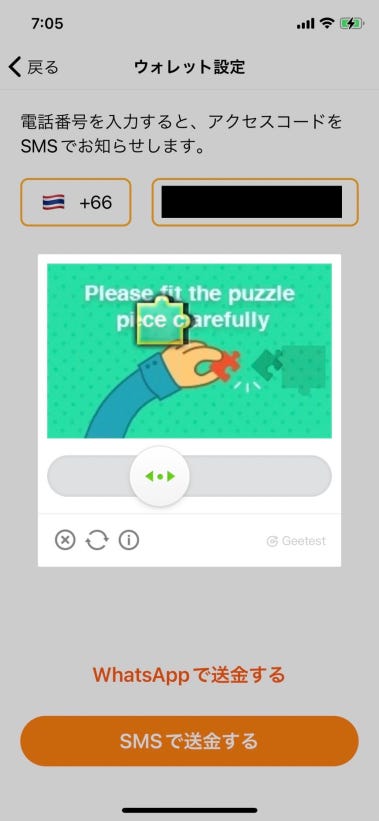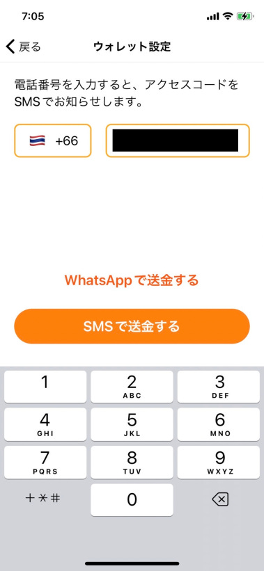 あなたの国コード(今回は僕がタイ在住なので +66、日本在住なら +81)を選択し、電話番号を入力後「SMSで送信する」をタップします。