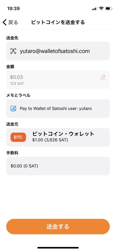 送金先の Lightning アドレスと、送金額に間違いがなければ(今回の場合は 123 SAT)、「送金する」をタップして送金を完了します。