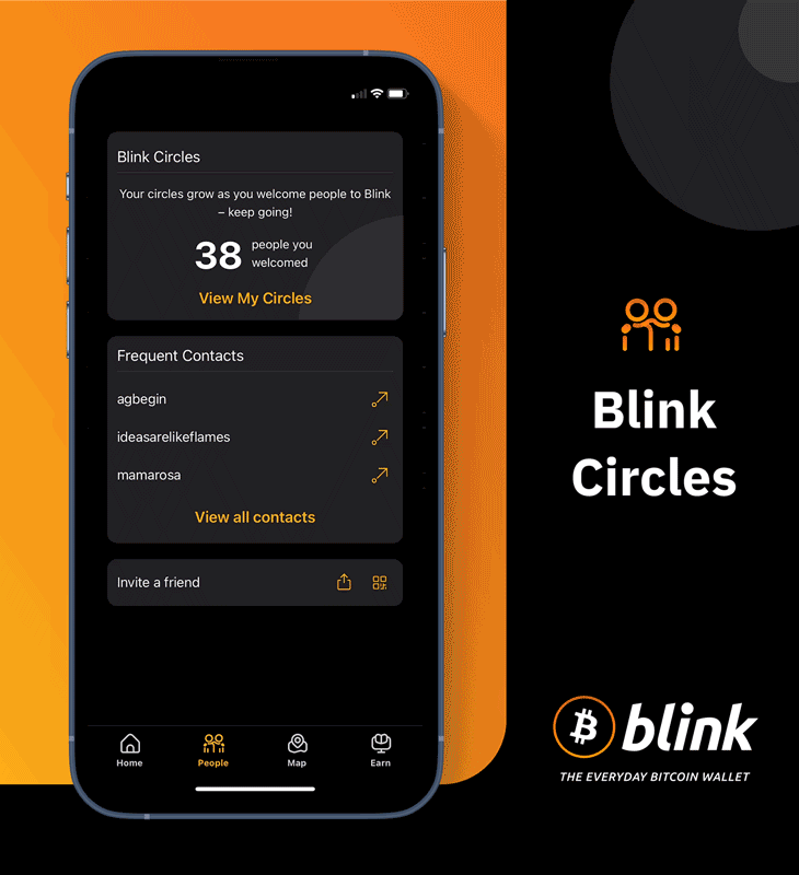 インナーサークル:あなたが Blink Wallet にお友だちを招待して、最初の satoshi (sats) を送金することで広がるサークルです。