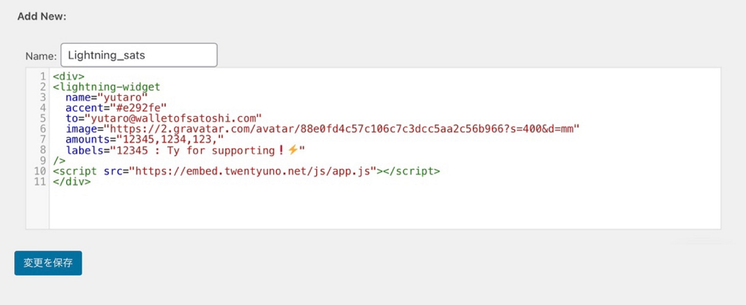 「Name」部分は何でも良いのですが、今回は “Lightning_sats”としました。入力が完了したら、「変更を保存」をクリックします。