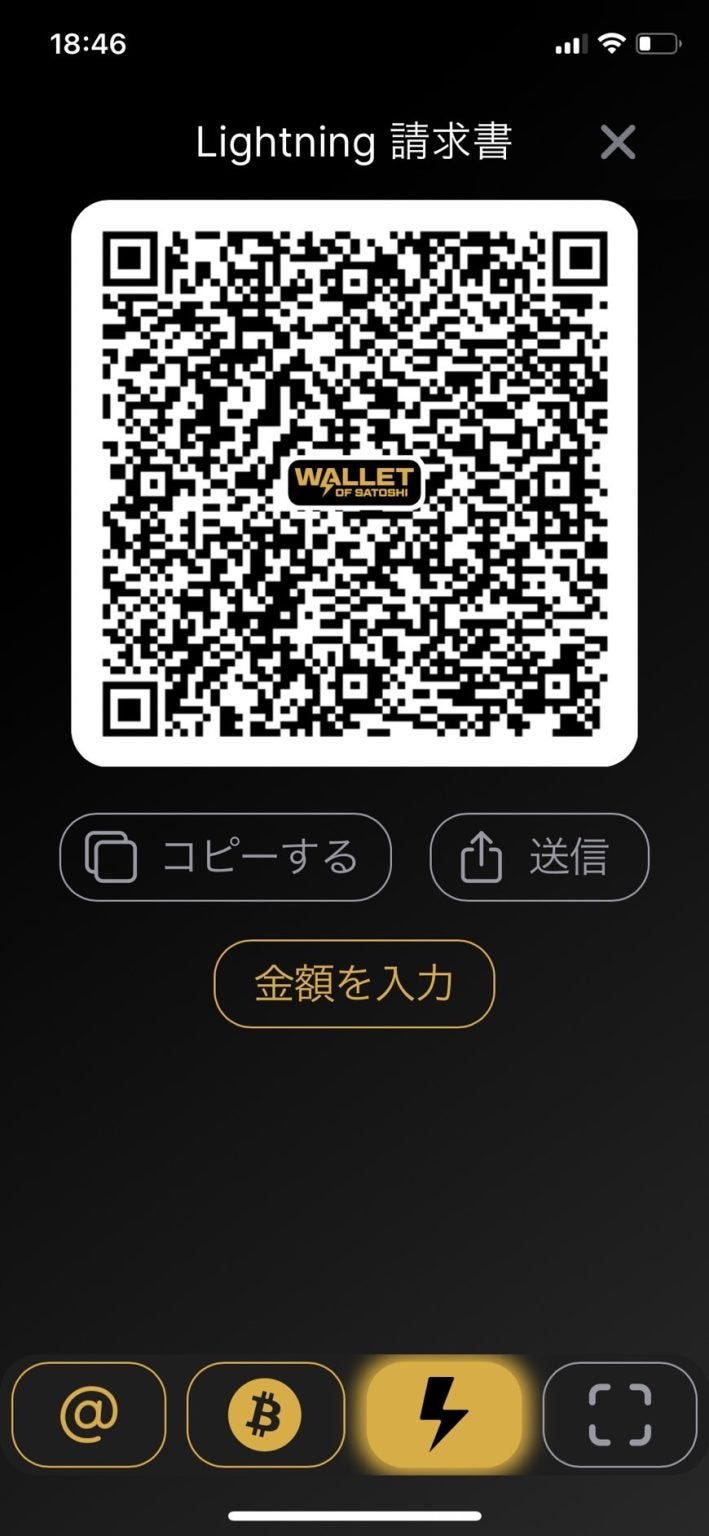 最後の「⚡️」をタップすると、この画面も同じように QRコードによる Lightning 受信に対応しています。