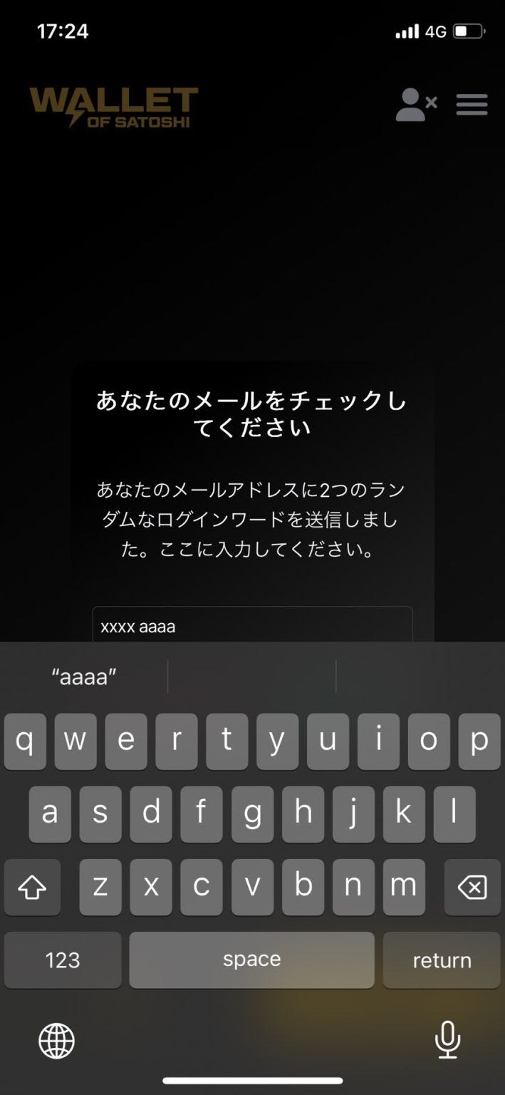 すぐに Wallet of Satoshi から、あなたのメールアドレス宛に2つのパスワード(キーワード)が自動送信されてきます。